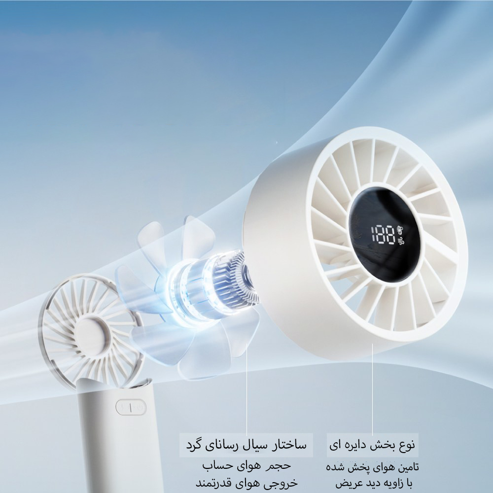 | محتویات بسته بندی | پنکه دستی، کابل شارژ USB، دفترچه راهنما، بند دستی |