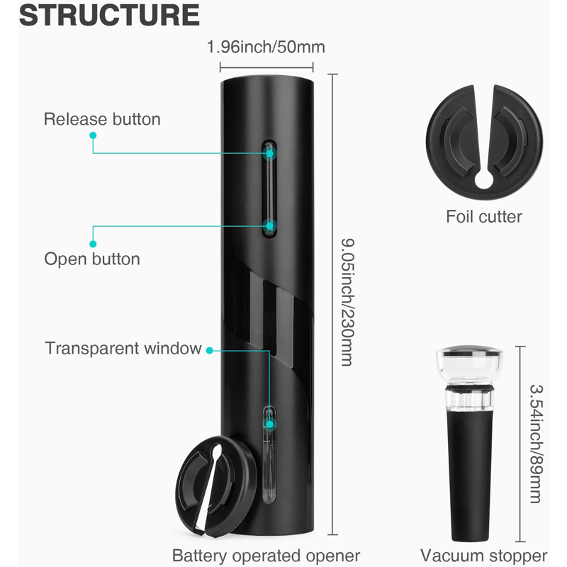 | اجزا | چوب پنبه بازکن برقی، درپوش خلاء، چاقو فویل، نازل نوشیدنی الکتریکی |