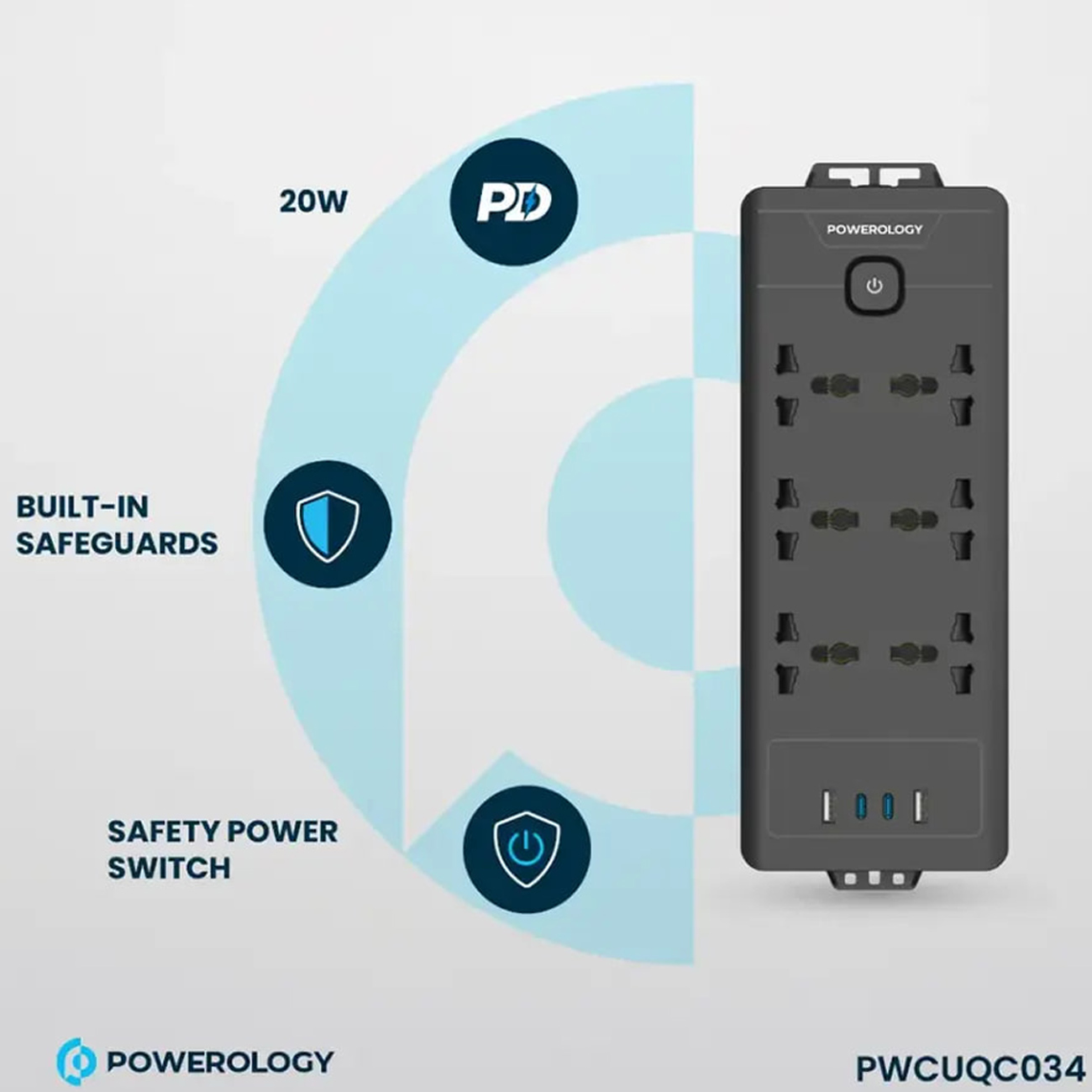 چند راهی و محافظ برق 2500 وات 6 سوکت، 2*USB و 2*تایپسی پاورولوژی PWCUQC034