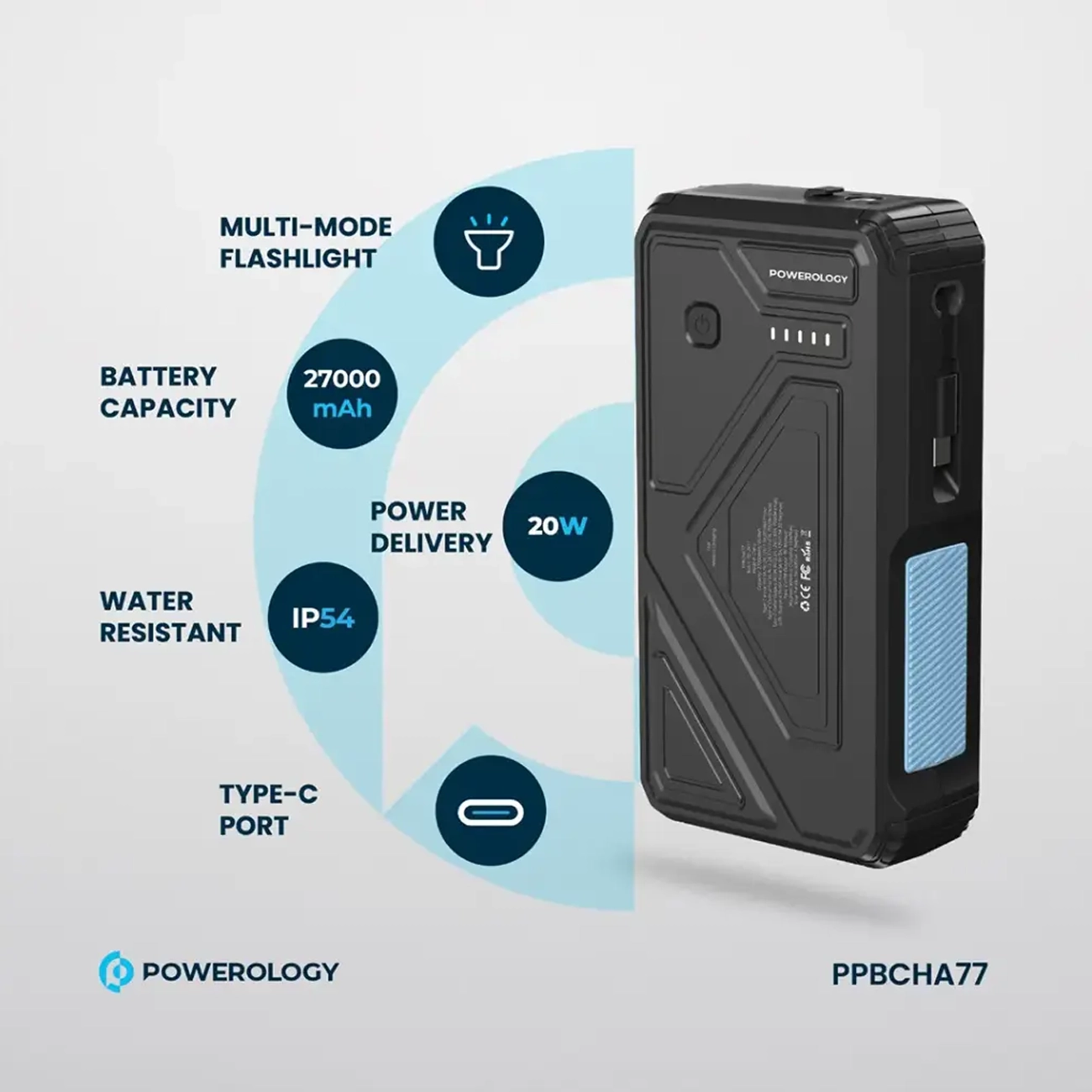 Powerology 27000mAh solar wireless charging power bank with multi mode flashlight