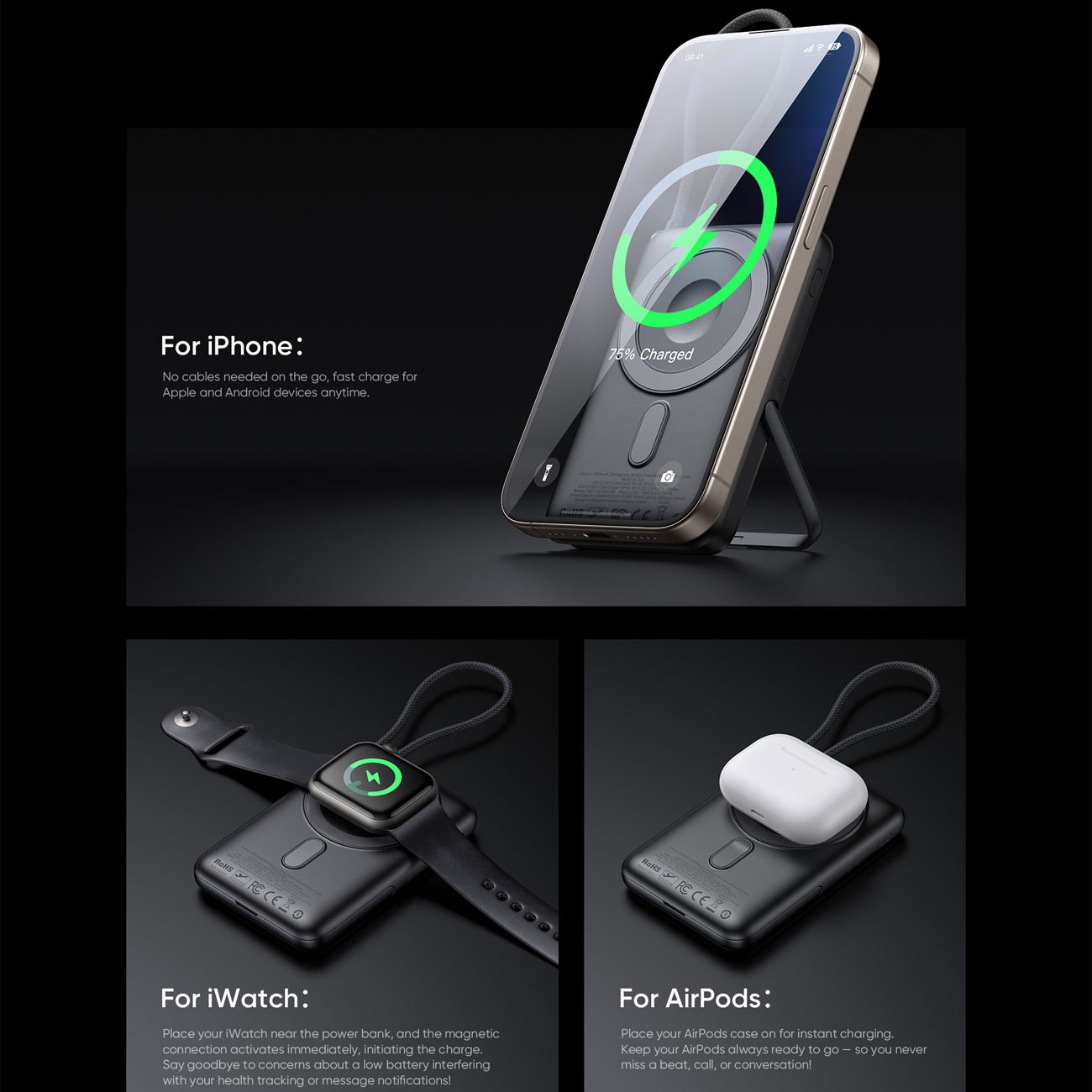 سازگار با تمام مدل‌های اپل واچ با پورت شارژ مغناطیسی: Apple Watch Ultra (49mm) Apple Watch Series 9 (41mm و 45mm) Apple Watch Series 8 (41mm و 45mm) Apple Watch Series 7 (41mm و 45mm) Apple Watch SE (2022 و 2023) Apple Watch Series 6 (40mm و 44mm) Apple Watch Series 5 (40mm و 44mm) Apple Watch Series 4 (40mm و 44mm) Apple Watch Series 3 (38mm و 42mm) تمام مدل‌های ایرپاد با پشتیبانی از شارژ بی‌سیم (Qi): AirPods Pro (نسل 1، 2 و 3) AirPods (نسل 3 و 2) AirPods Pro Max گوشی‌های اندروید و آیفون با قابلیت پشتیبانی از شارژ وایرلس
