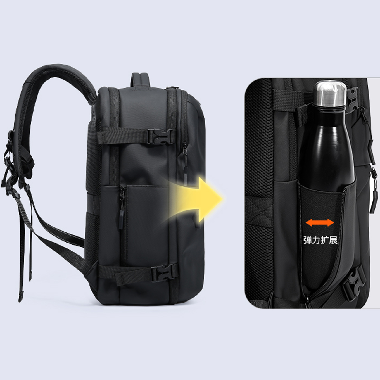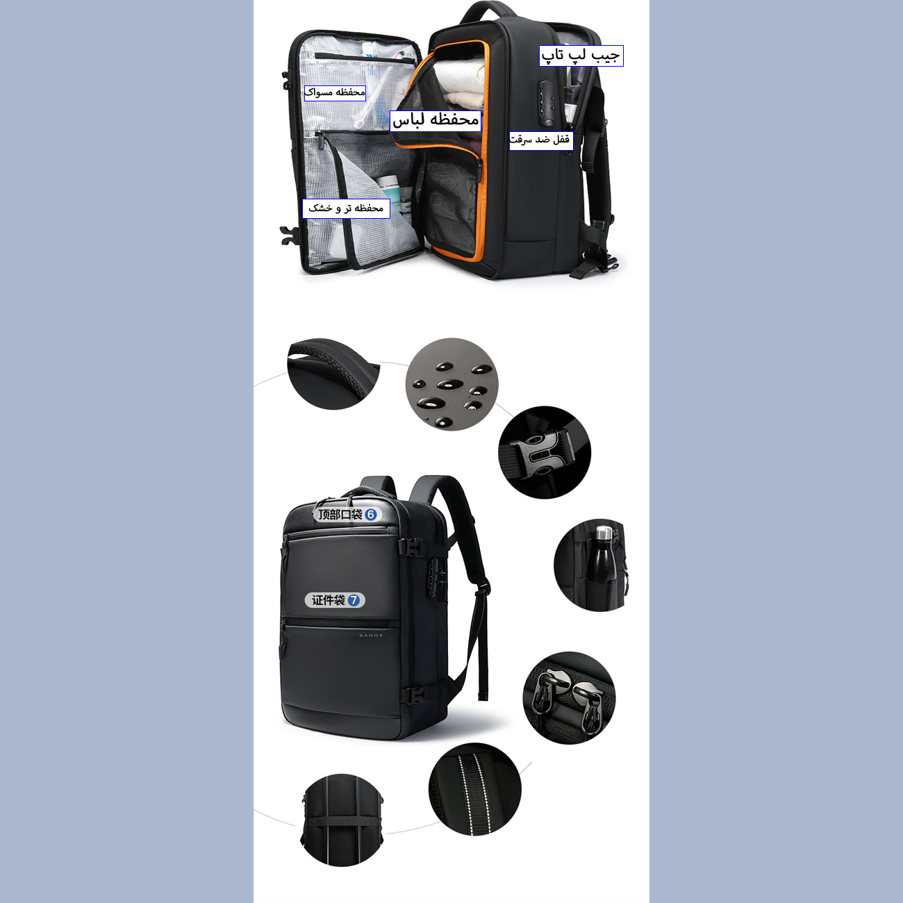 | بخش بندی داخلی | - بخش شستوشو/لباس کثیف (Wash area) - بخش لپتاپ/دیجیتال (Digital/Computer compartment) - بخش اصلی لباسها (Main compartment) - دو عدد کیف جداسازی خشک/تر - جیب بالایی برای مدارک - جیب کناری برای بطری - جیب مخفی جانبی برای موبایل یا کیفپول |