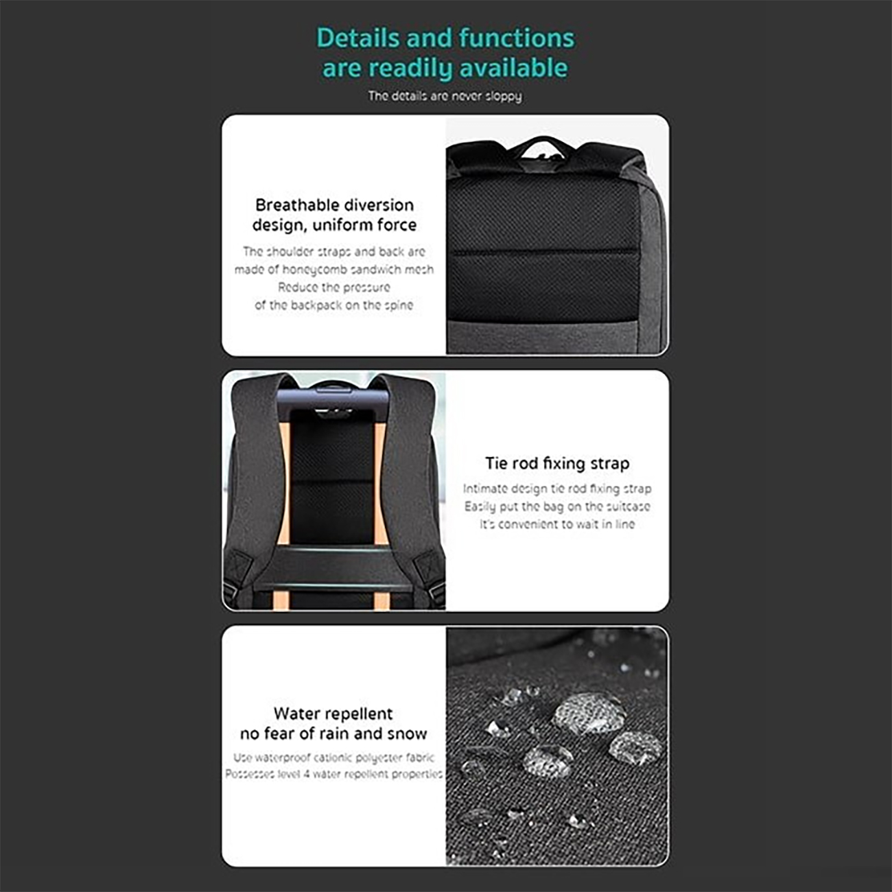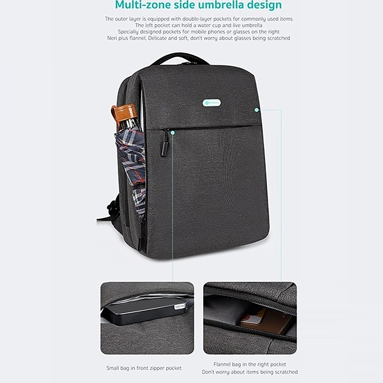 | تعداد جیب | یک محفظه اصلی با جیبهای مجزا و دو جیب کوچک زیپ دار در قسمت جلو |