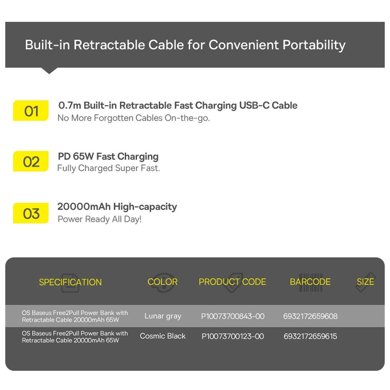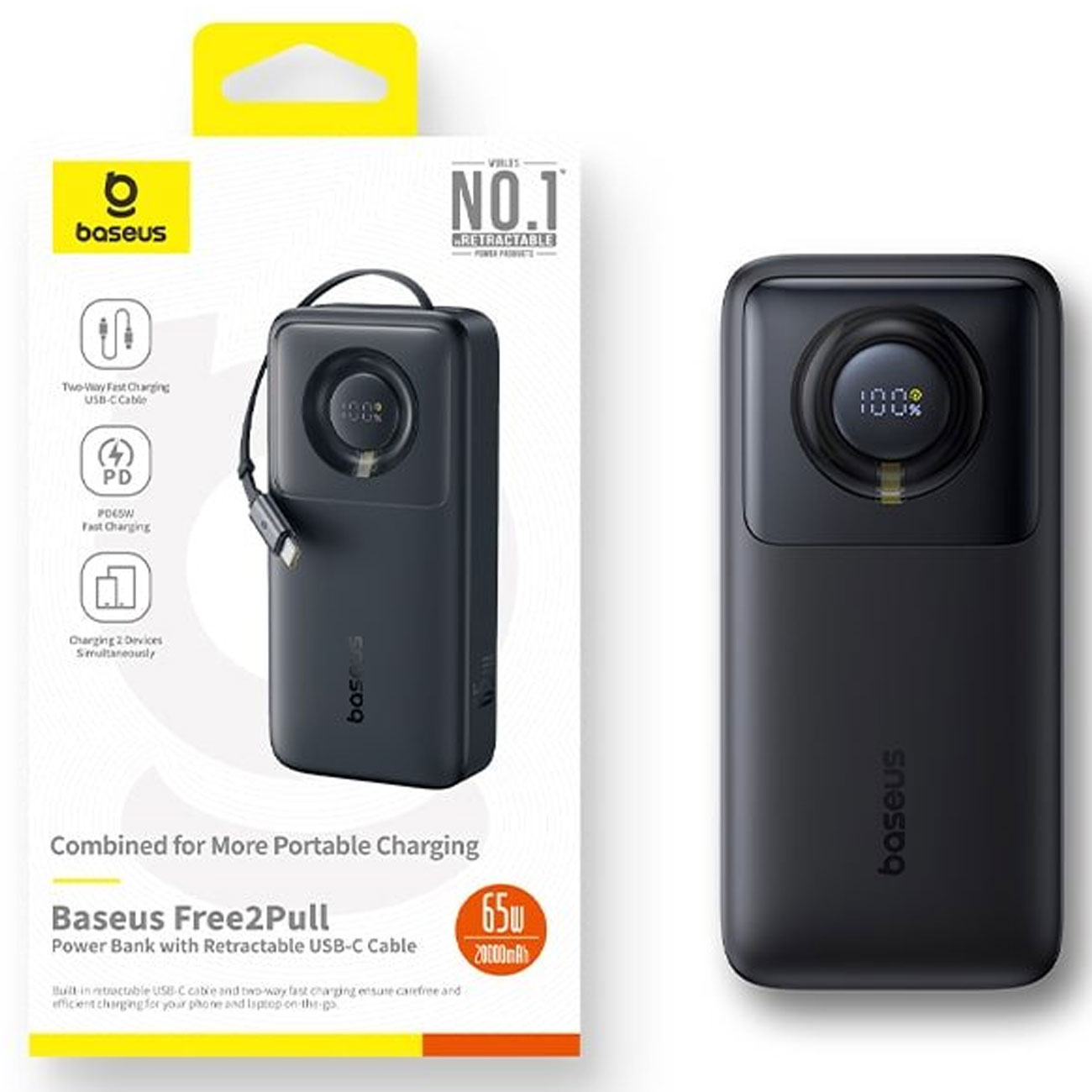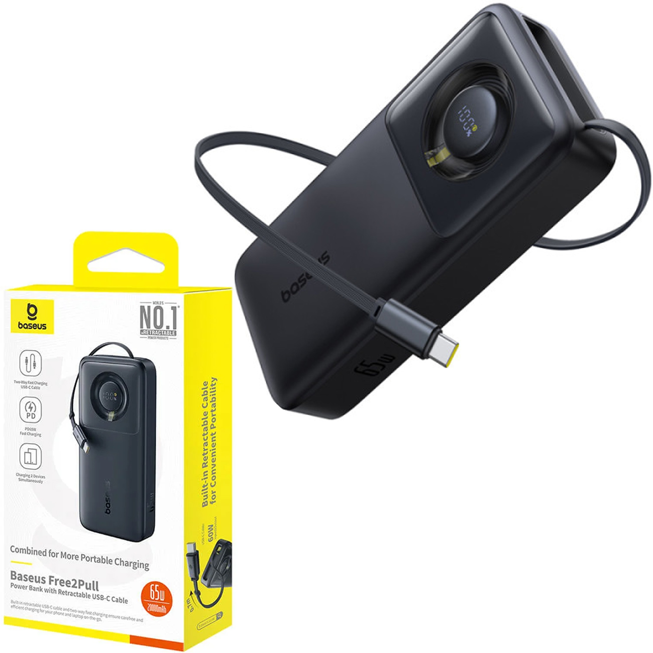 Baseus PPLSC01-20 P10073700123-00 Free2Pull Power Bank with Retractable USB-C Cable 20000mAh 65W