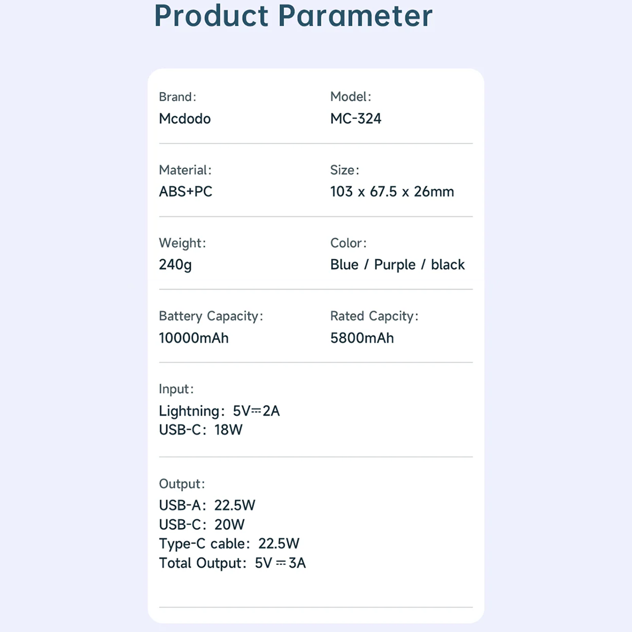 MCDODO MC-324 PD 22.5W 10000mAh Power Bank