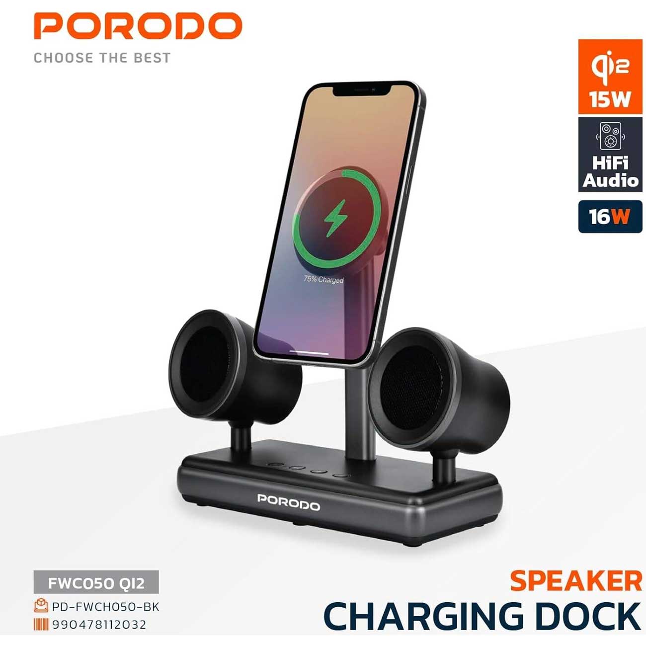 اسپیکر بلوتوثی و شارژر وایرلس پورودو Porodo مدل PD-FWCH050-BK یک دستگاه همهکاره و کاربردی برای پخش موسیقی و شارژ سریع گوشیهای هوشمند است. این محصول با طراحی مدرن و جمعوجور، امکان گوش دادن به موسیقی با کیفیت و شارژ بیسیم همزمان را فراهم میکند و گزینهای ایدهآل برای میز کار، اتاق خواب یا سفر محسوب میشود.