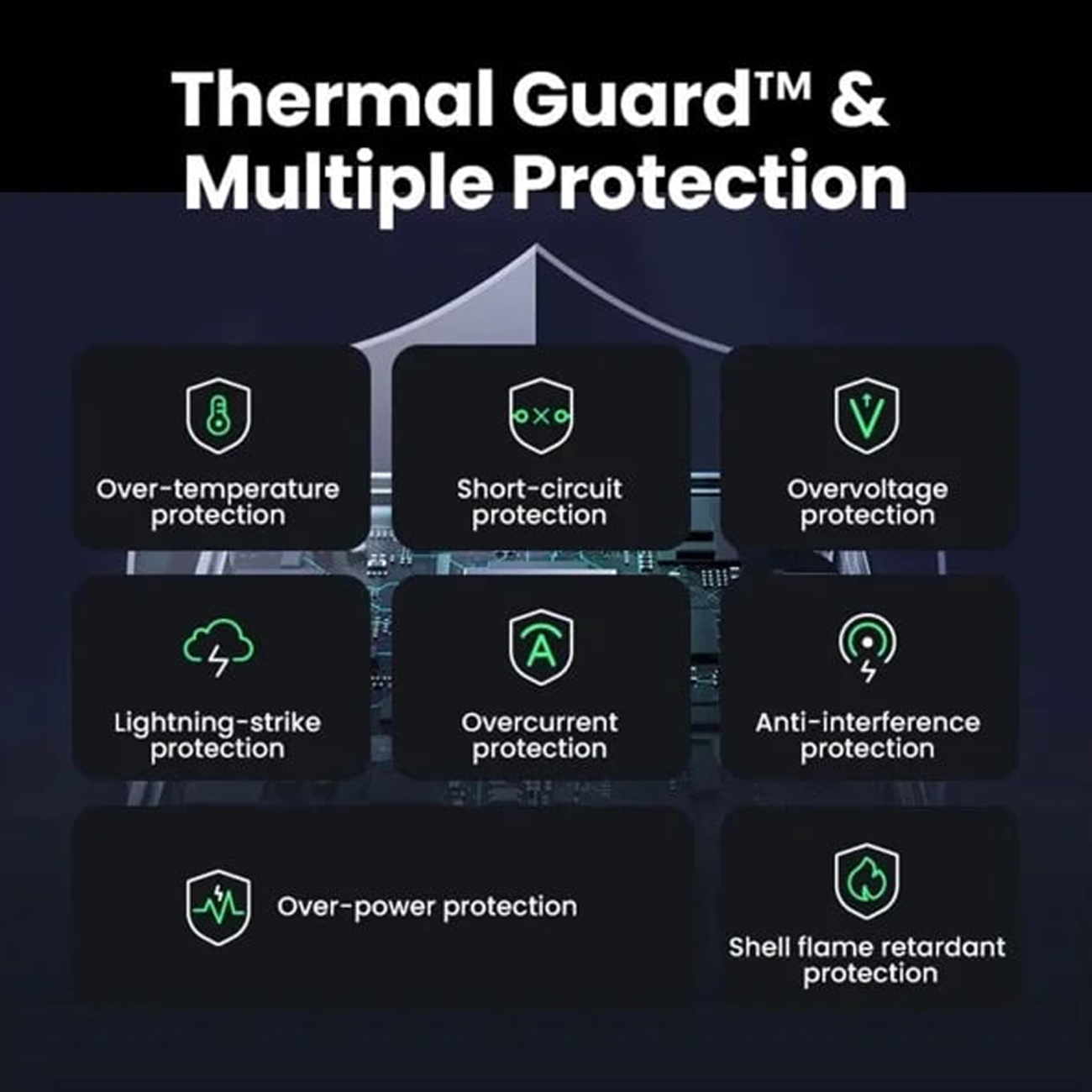 | ویژگی های ایمنی | محافظت در برابر اتصال کوتاه، نوسان ولتاژ و جریان، گرمای بیش از حد، Thermal Guard™, Lightning-strike protection, Overcurrent protection, Overvoltage protection, Anti-interference protection, Over-power protection, Shell flame retardant protection |