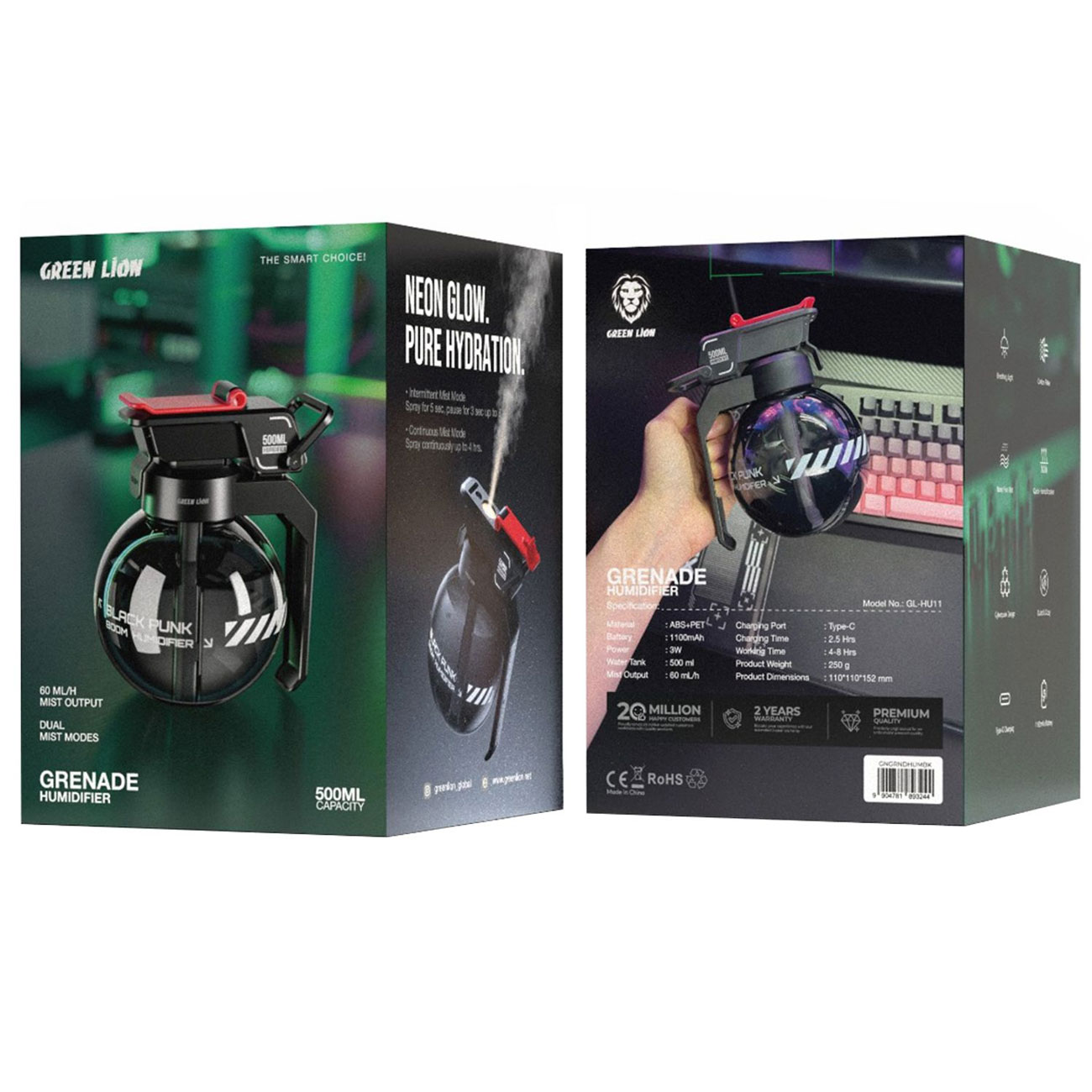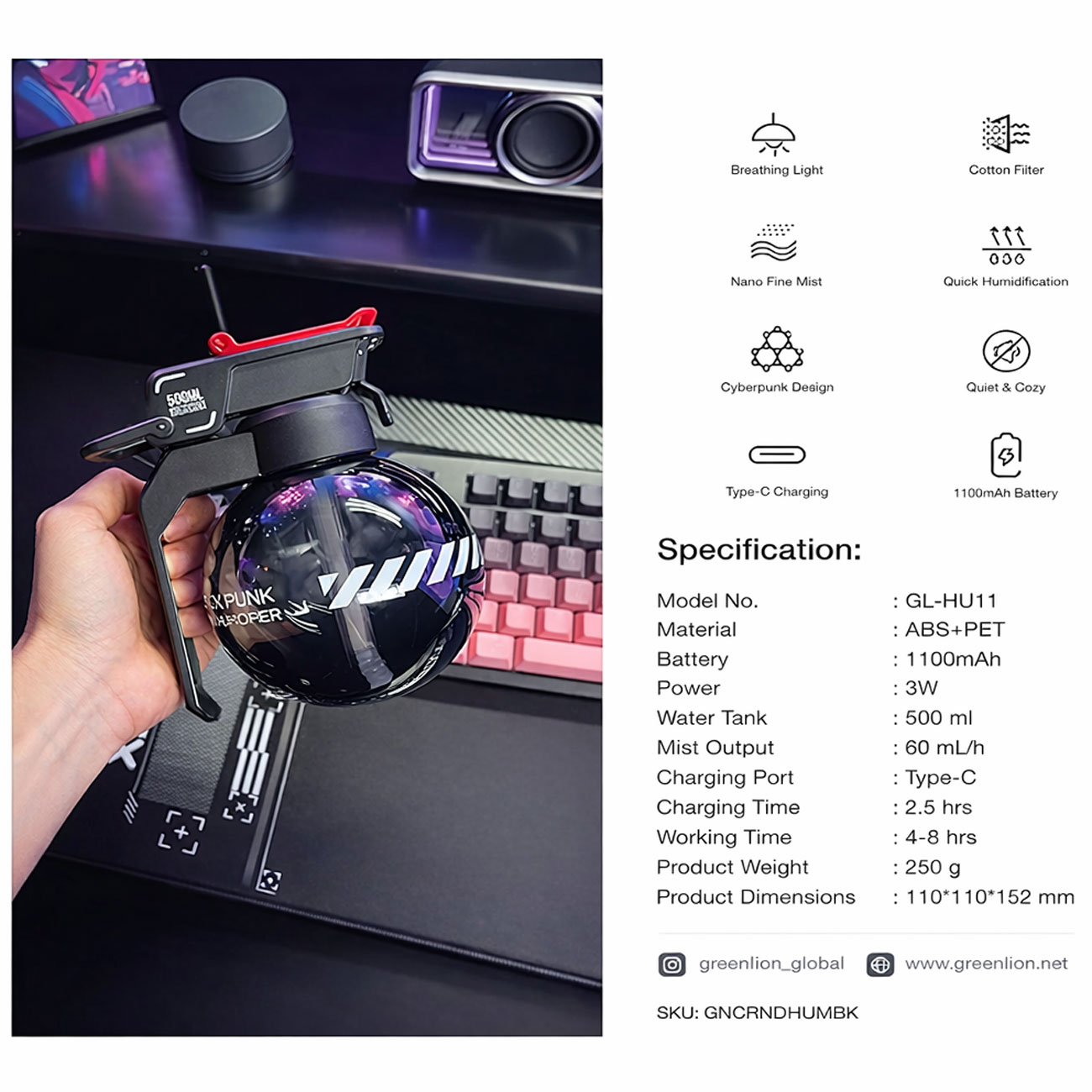 Green Lion GNGRNDHUMBK Grenade Rechargeable Cool Mist Humidifier 500mL GL-HU11