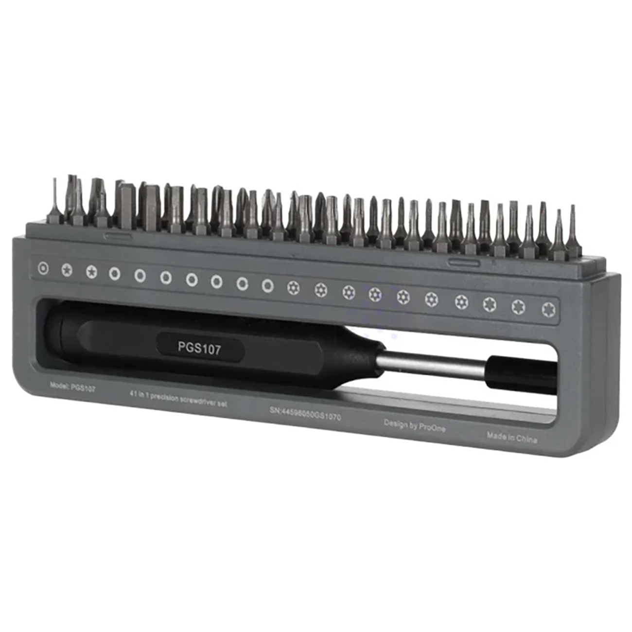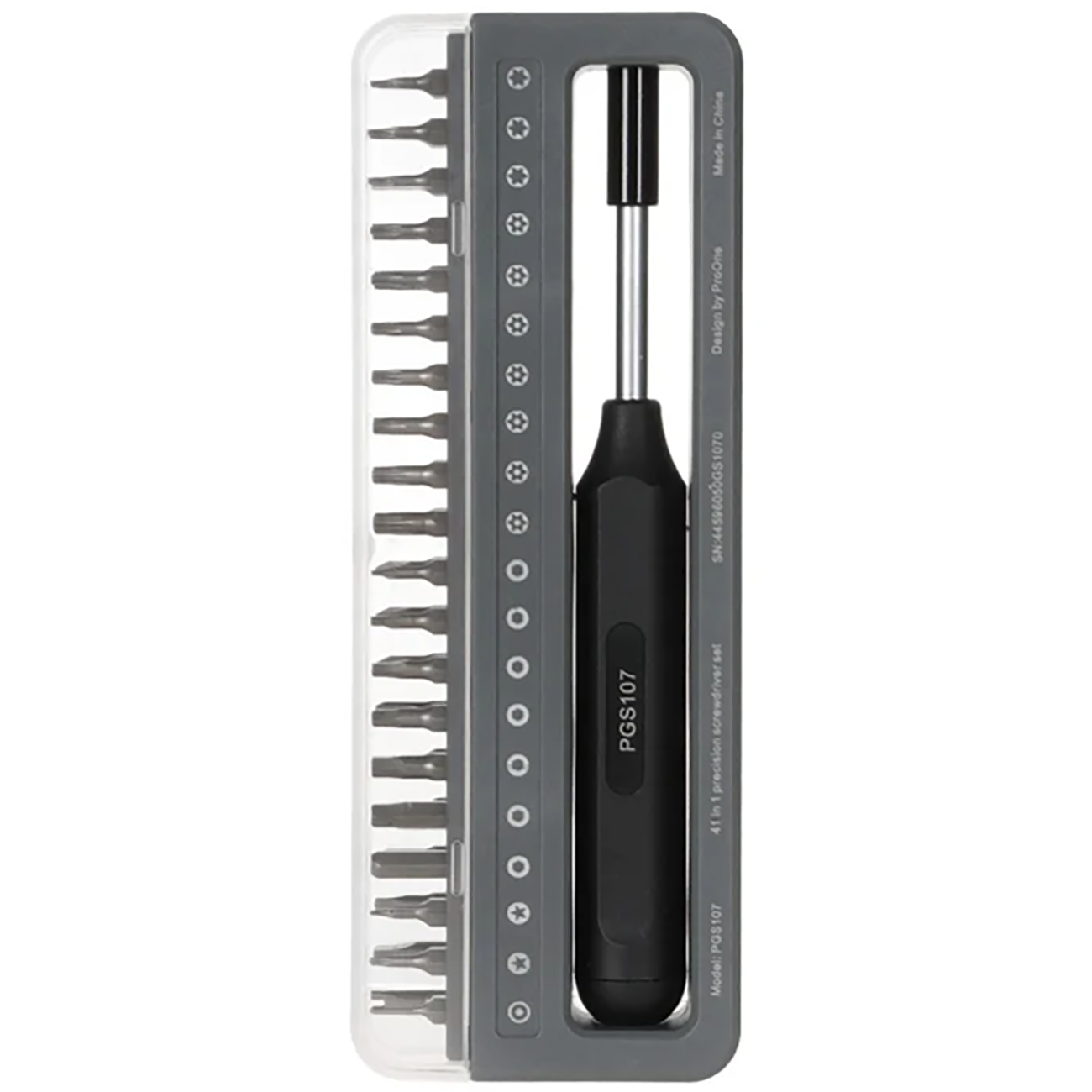 ست پیچگوشتی 41 عددی ProOne مدل PGS107 یک مجموعه کامل و کاربردی برای انجام انواع تعمیرات خانگی، الکترونیکی و فنی است. این ست با تنوع بالای سریها و طراحی دقیق، امکان باز و بسته کردن پیچهای مختلف را با دقت و سرعت بالا فراهم میکند و انتخابی ایدهآل برای کاربران حرفهای و نیمهحرفهای به شمار میرود.
