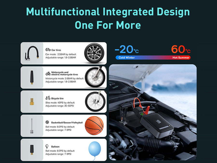 جامپاستارتر، کمپرسورباد و پاوربانک 8000 فوق انرژی خودرو بیسوس Baseus super energy 2-in-1 jump starter 1000A BS-CH003 CGCN000001