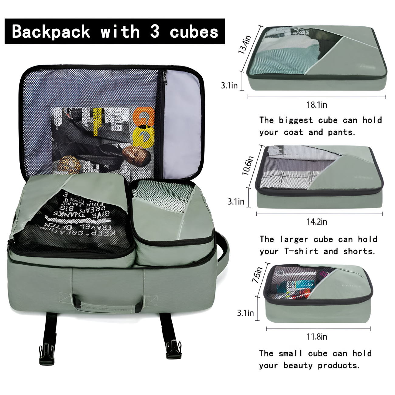 | محتویات همراه | 3 عدد کیف مکعب تفکیکی: بزرگ برای پالتو/شلوار، متوسط برای تیشرت، کوچک برای وسایل آرایشی |