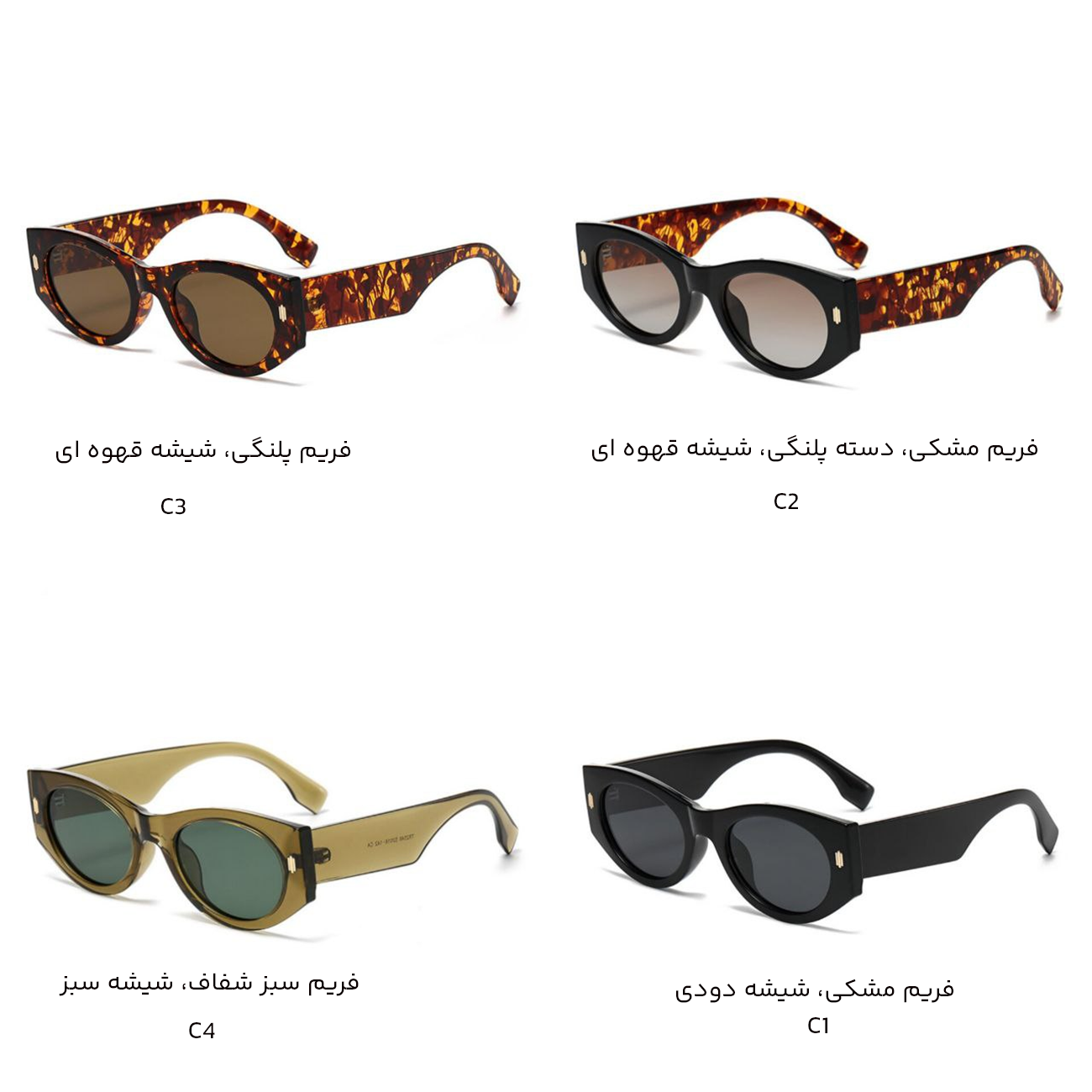 | رنگ بندی متنوع و جذاب | فریم مشکی، دسته پلنگی، شیشه قهوه ای c2/ فریم پلنگی، شیشه قهوه ای C3/ فریم مشکی، شیشه دودی C1 / فریم سبز شفاف، شیشه سبز C4 |
