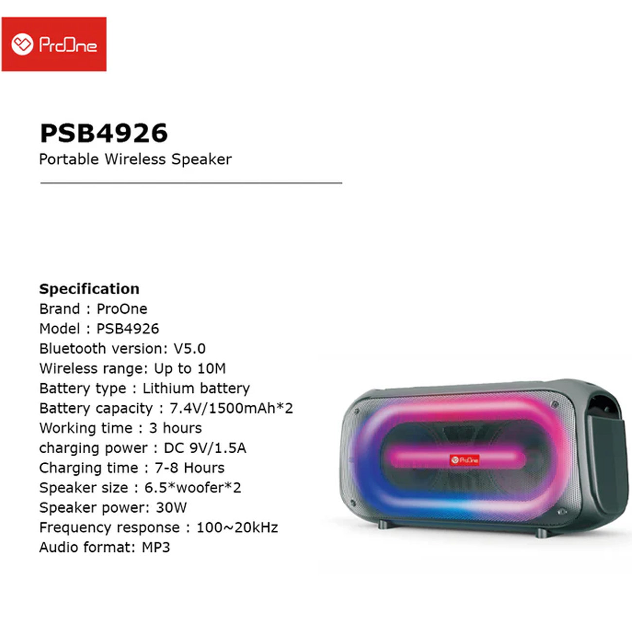 ProOne PSB4926 صدایی شفاف و قدرتمند با بیس مناسب ارائه میدهد که برای پخش موسیقی، پادکست، فیلم و تماسهای صوتی مناسب است. طراحی بلندگو به گونهای انجام شده که صدا در تمام جهات بهخوبی پخش شود و تجربهای زنده و جذاب ایجاد کند.