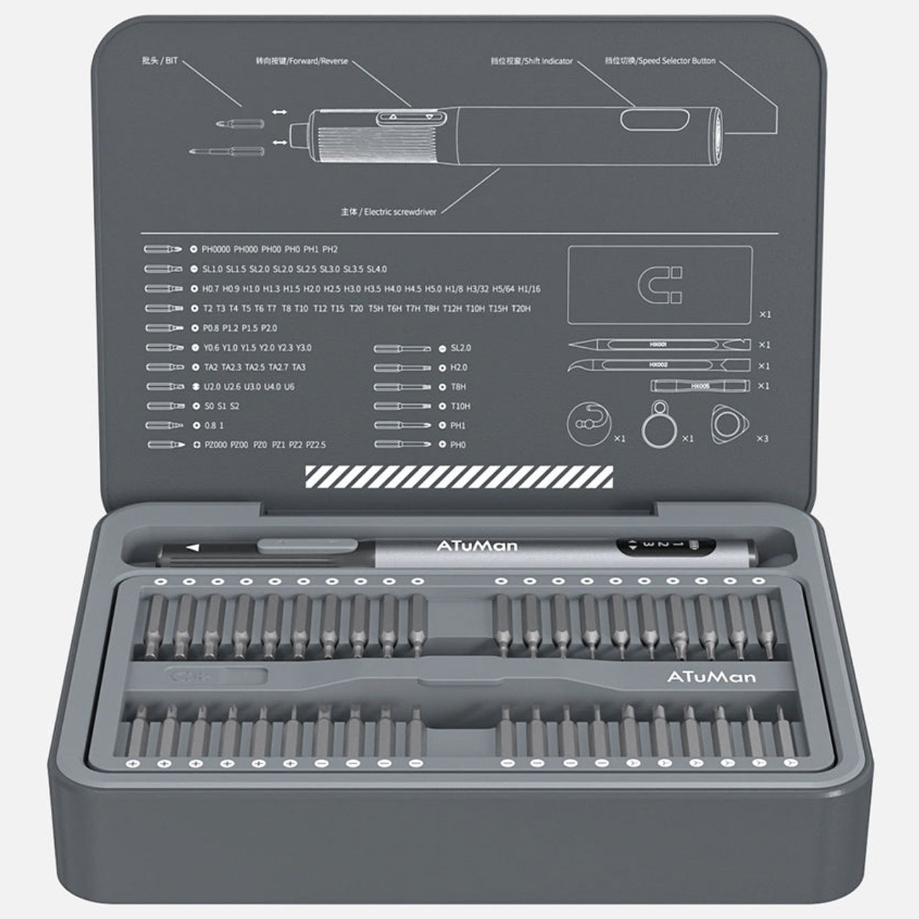 خرید پیچگوشتی الکتریکی آتومن ATuMan E3 با 95 قطعه، موتور 230RPM و گشتاور 3 سرعته. بهترین ابزار دقیق شیائومی برای تعمیر موبایل و الکترونیک.
