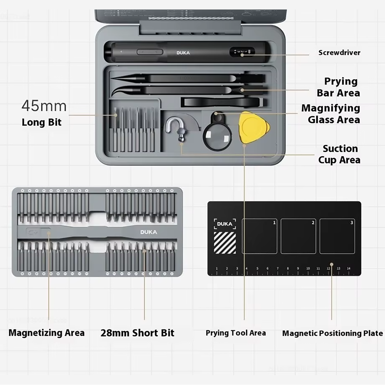 - طراحی نگهداری: دارای یک صفحه مغناطیسی با روکش لاستیکی ضدخش برای نگهداری ایمن پیچها و قطعات باز شده.