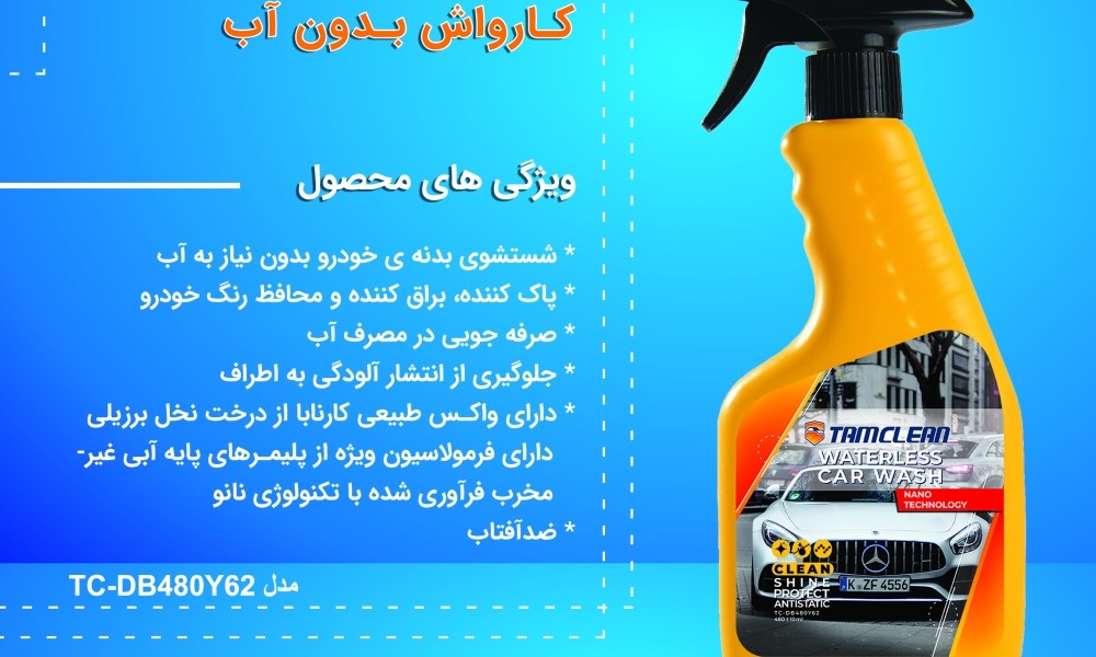 اسپری کارواش بدون آب مدل TC_DB480Y62 محصول استراتژیک برند تخصصی تام کلین است. شما به کمک آن می توانید در هرکجا که هستید ماشین خود را بدون استفاده از آب تمیز کنید.