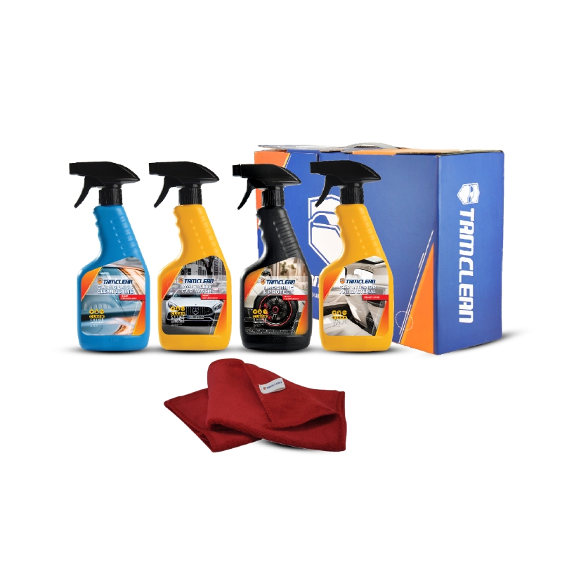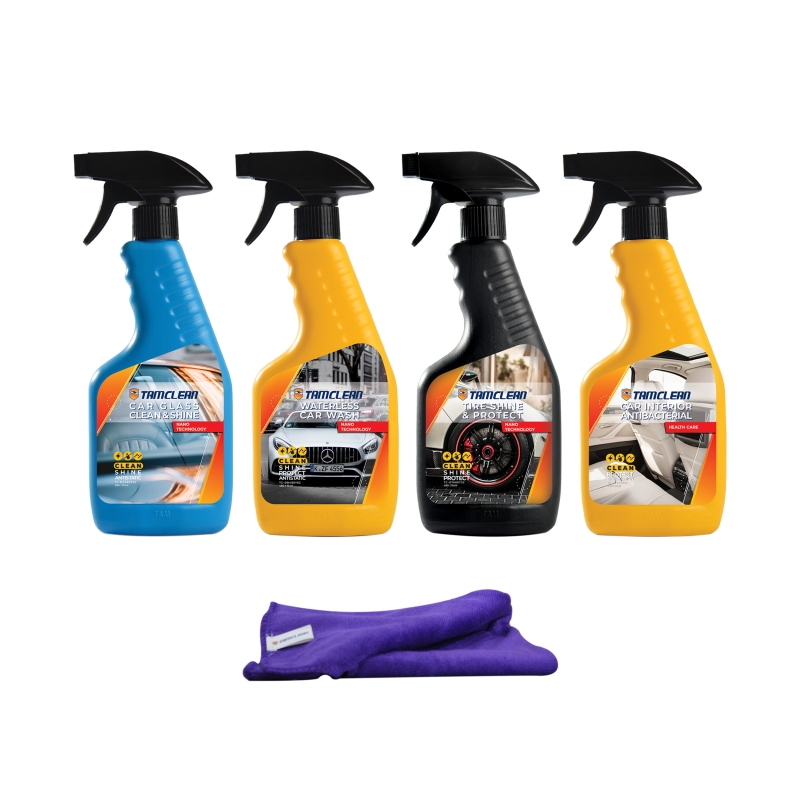 این پک شامل یک عدد اسپری کارواش نانو، یک عدد اسپری تمیز و براق کننده شیشه خودرو، یک عدد اسپری تمیز و براق کننده لاستیک، یک عدد اسپری آنتی باکتریال داخل خودرو، به همراه یک عدد دستمال میکروفایبر ضد خش تام کلین می باشد.